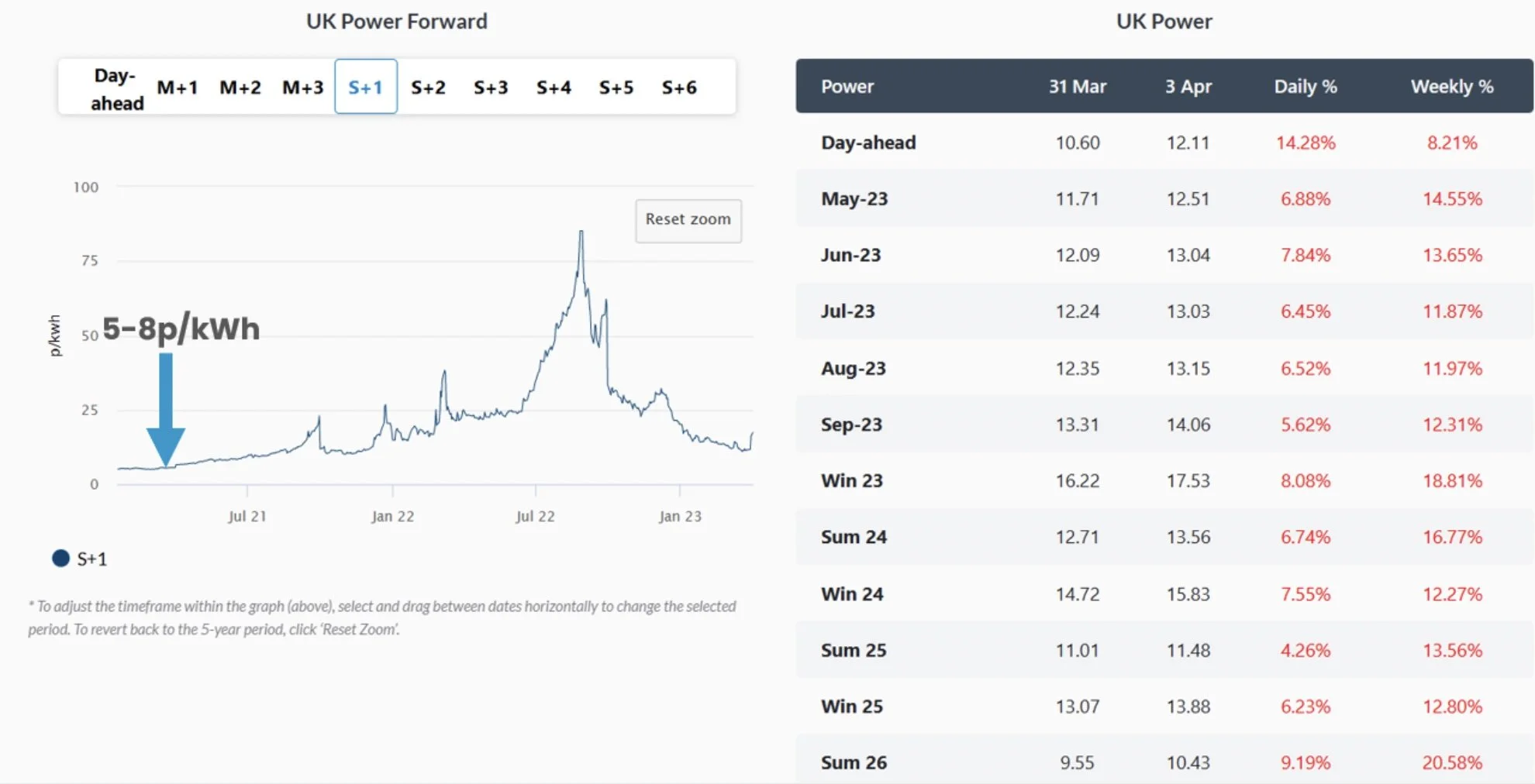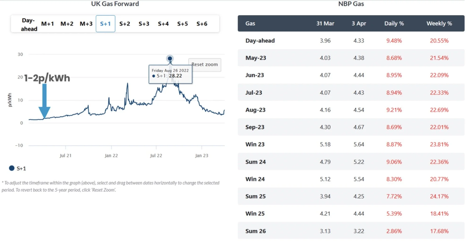 The two graphs below show the current wholesale market in the UK. The energy market has softened significantly in the past few months, but prices are still much higher than they used to be before 2022. It does seem that the new price levels are the new normal for energy prices in the UK.